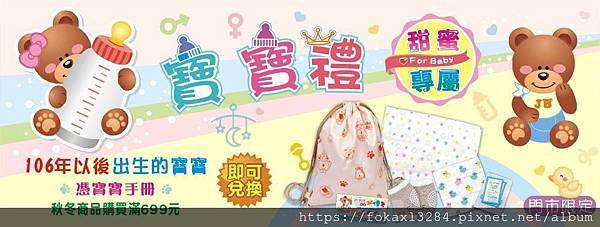 憑寶寶手冊秋冬商品購買滿699元,贈送甜蜜專屬寶寶禮